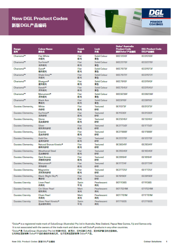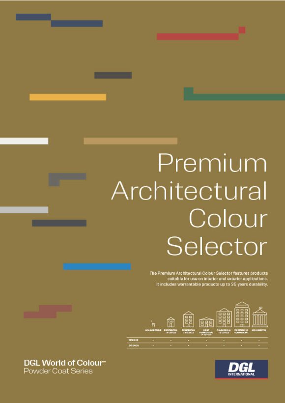 The DGL Premium Architectural Colour range aligns with the Dulux* Premium Architectural Colour range available in Australia and New Zealand. The ranges are represented in aligned colour collateral available in each brand, including colour selectors and powder coated swatches.