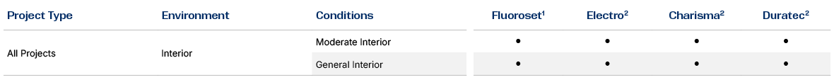 Use the following table to help identify the product choice you have for the interior use of DGL Premium Powder coatings on your project. Refer to the conditions information to determine the environment that your project will be exposed to.