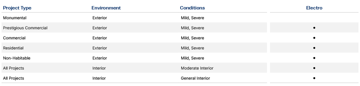 Use the following table to help identify where Electro™ can be applied on aluminium projects, the system required and the DGL Alumi Shield™ warranty level available. Refer to the conditions information to determine the environment that your project will be exposed to.