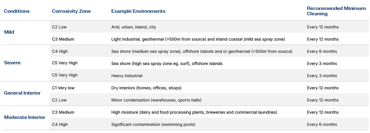 Use the following table which references AS 2312.1, SNZ TS 3404 and ISO 9223 to identify the environment, conditions and atmospheric corrosivity categories.
