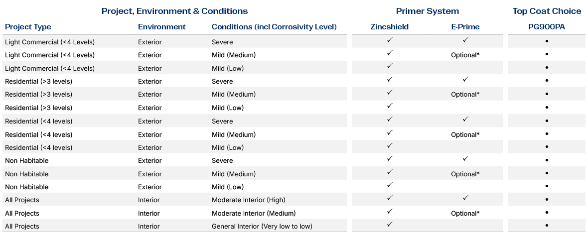 PG900PA can also be used on the following metals, but these do not have a product guarantee. Steel (mild), bright/semi bright steel, black steel and blue steel. Galvanised steel, stainless steel and Zincalume®. Use the following table to help identify the product choice on your project. Refer to the conditions information to determine the environment that your project will be exposed to.